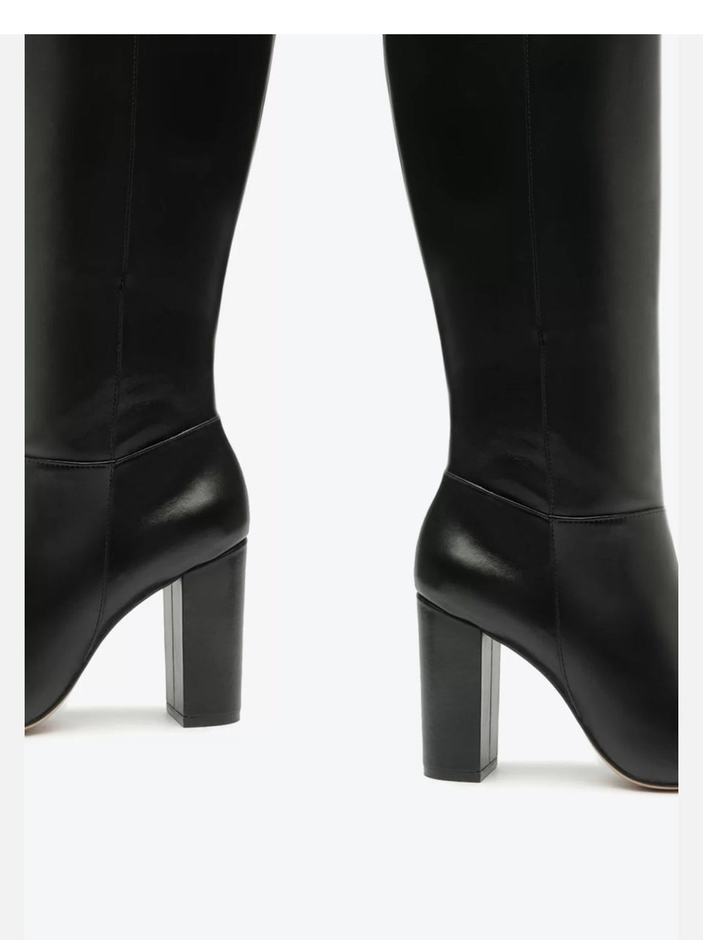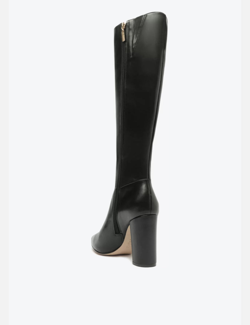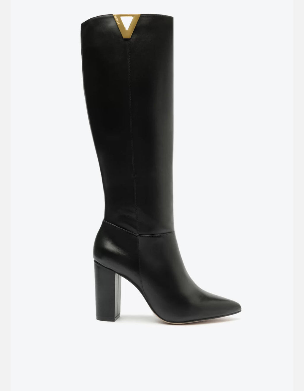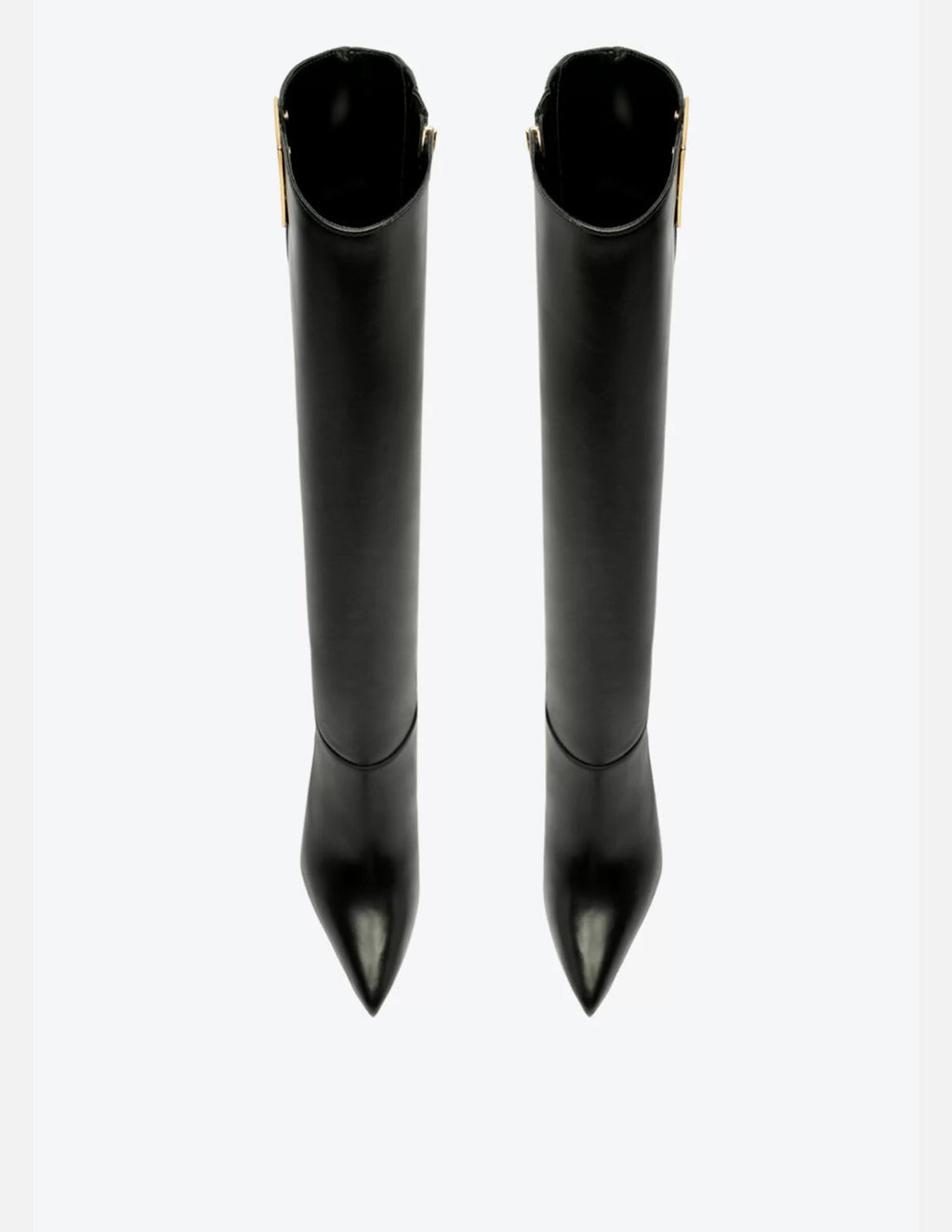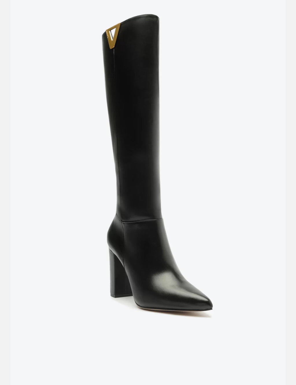 Explore o poder da moda com nossas botas over, a peça-chave para transformar até mesmo os looks mais básicos em algo extraordinário. Com um design imponente em couro, bico levemente fino e salto bloco alto, o detalhe de metal na lateral em formato de triângulo é o toque final de sofisticação que você precisa.