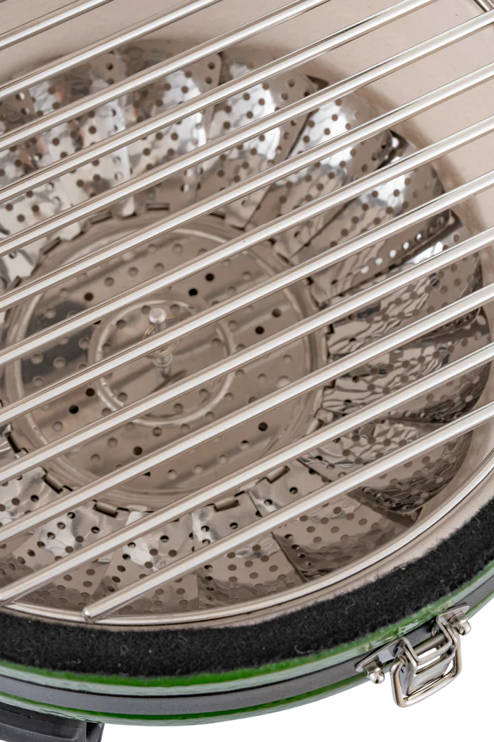 Controle a temperatura facilmente ajustando o Fluxo de Ar inferior e superior. Mantenha a temperatura apenas fechando a entrada de ar. Quer apagar o fogo? Basta aguardar alguns instantes com os Fluxos de Ar e a tampa do Kamado fechados.