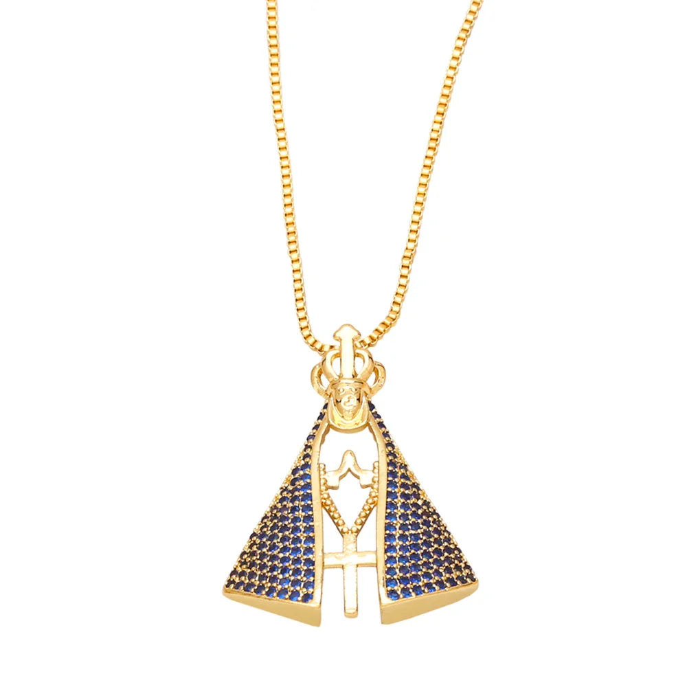 Este colar é uma verdadeira obra de arte, com duas faces magníficas que capturam a beleza e a espiritualidade da Virgem Maria de Aparecida. Com o manto adornado com zircônias cintilantes, cada lado deste colar é uma homenagem à nossa Mãe Protetora.