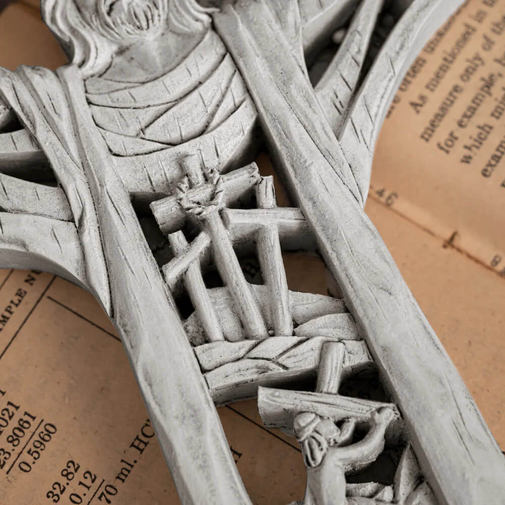 1. Uma cruz de parede de Cristo Ressuscitado com design exclusivo ; tons neutros; detalhes dimensionais da vida de Cristo em design aberto. O Cristo Ressuscitado... A agonia começará em breve, Ele sente o terrível peso do pecado.