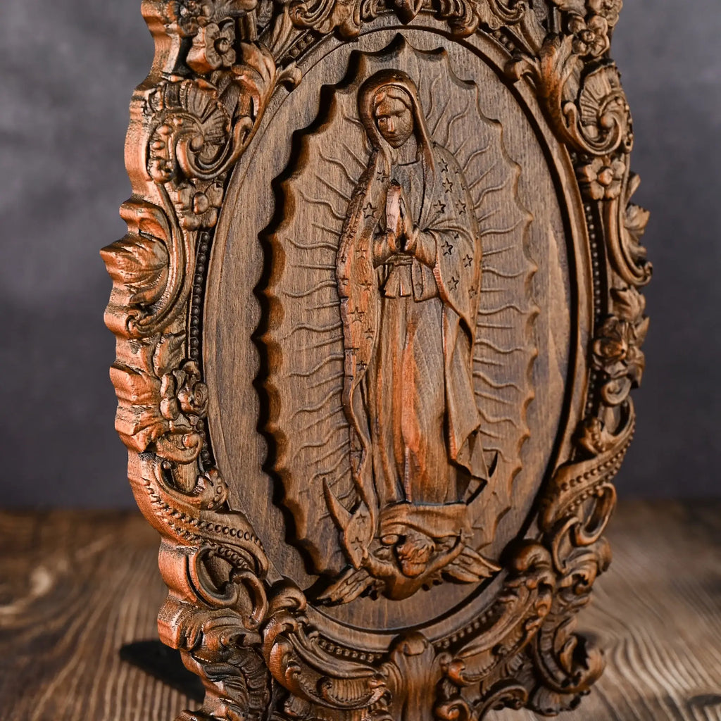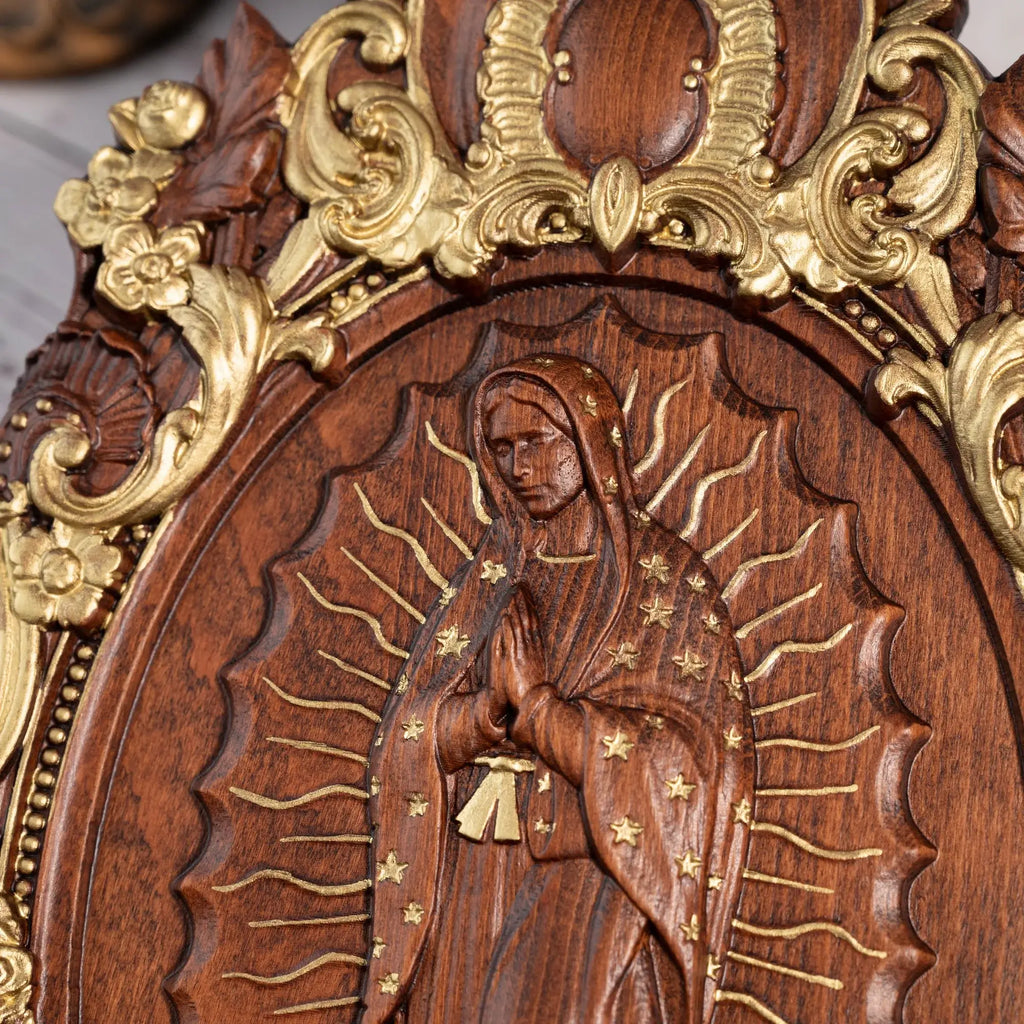 A venerada imagem que a talha de Nossa Senhora de Guadalupe traz é originária da Cidade do México e é o local de peregrinação católica mais visitado. Esta talha de Nossa Senhora de Guadalupe mostra a tradicional imagem de Nossa Senhora em pé sobre uma lua crescente e rodeada por um raio de sol dourado. Um anjinho em uma nuvem é visto na parte inferior, segurando as pontas de suas vestes. Sendo um poderoso símbolo de fé, a escultura em madeira de Nossa Senhora de Guadalupe irradia a maneira como Maria segura seus filhos em seu coração, como qualquer mãe protetora faz.