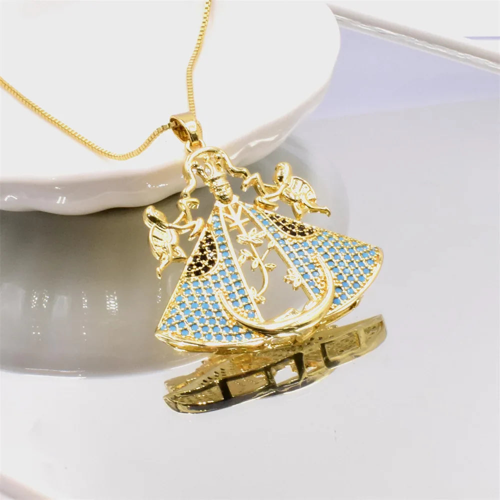 Este colar é mais do que uma simples joia; é uma expressão de devoção e beleza, capturando a essência da fé na Virgem Maria de Aparecida com elegância e estilo. Cada detalhe deste colar, adornado com zircônias cintilantes, é uma homenagem à nossa Mãe Protetora.