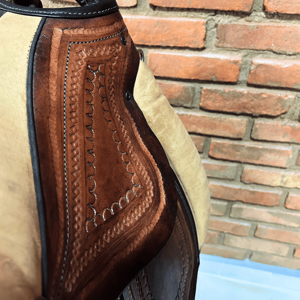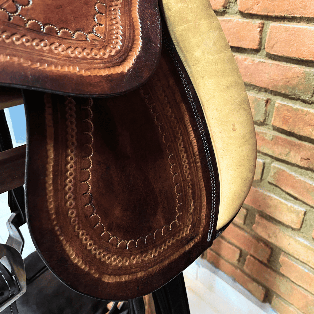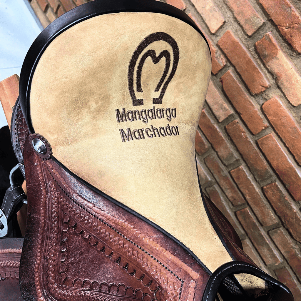 Sela Australiana Luxo confeccionada em couro, assento em Nobuck com bordado Mangalarga com densidade de espuma altamente resistente D60. Abas com borrainas compostas por vaqueta e espuma, para melhor comodidade e conforto durante a montaria. Arreatas em couro e forradas por fitas, ferragens em aço inoxidável anti ferrugem. Produto de acabamento impecável, resistente, bonito e de fácil fixação no animal!