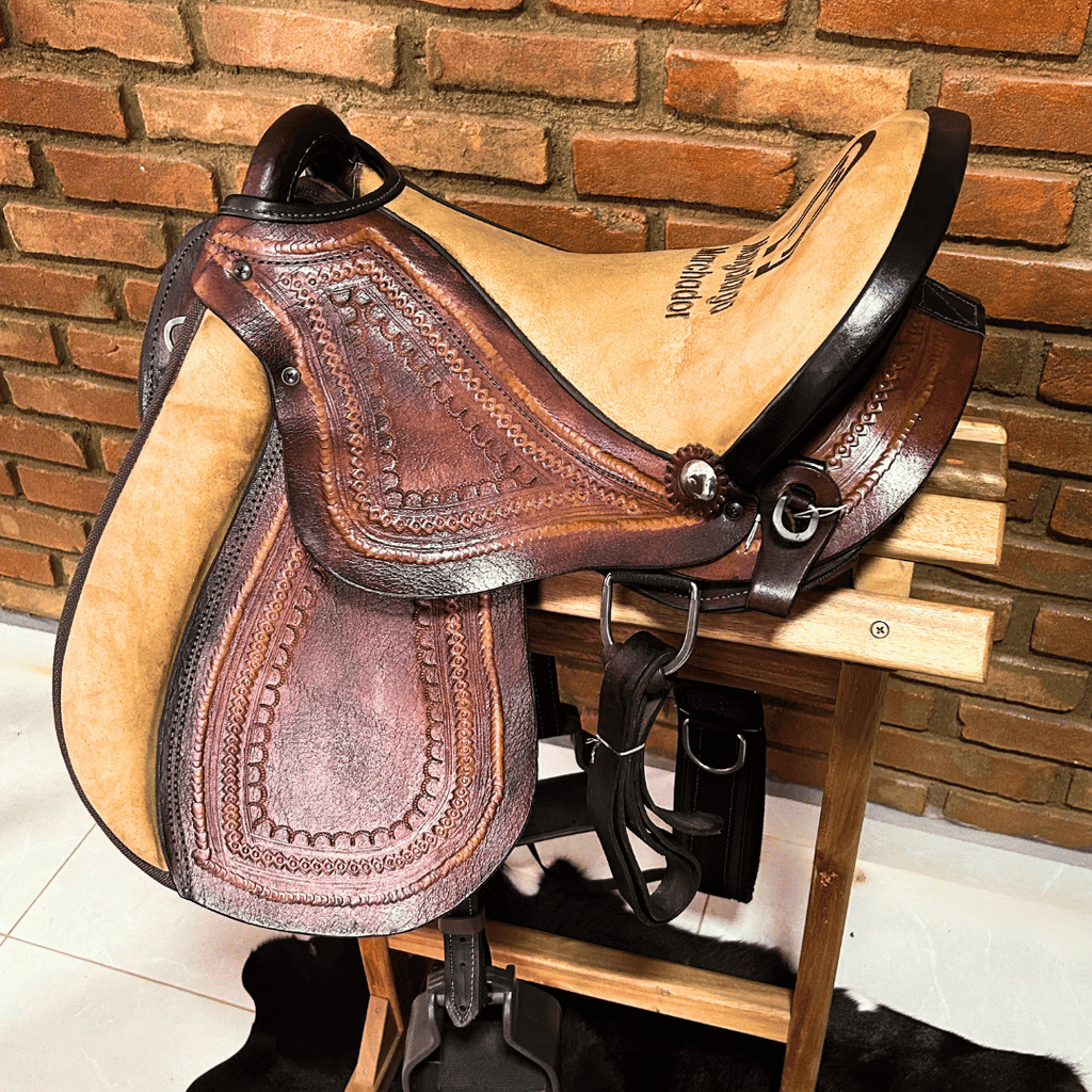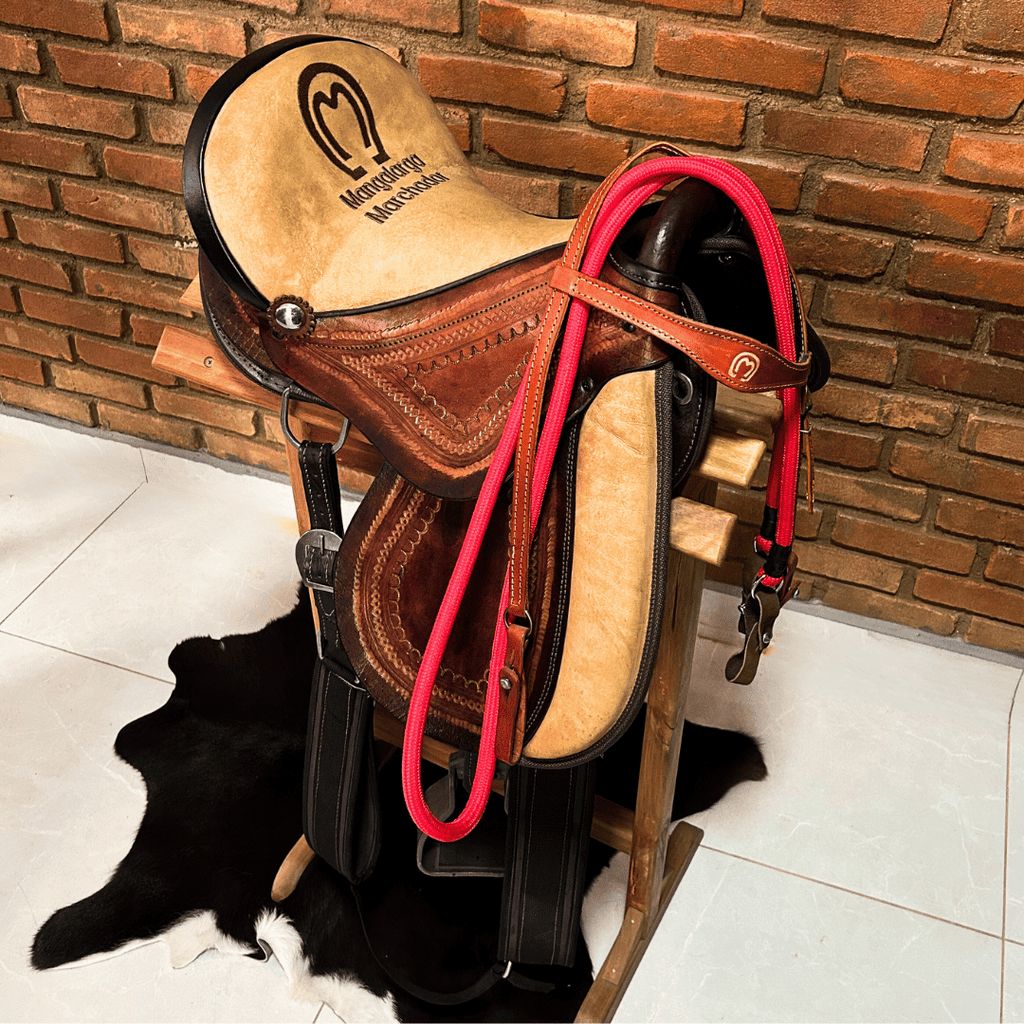 - ACOMPANHA: . 1 Cabeçada em Couro; . 1 Rédea de Polipropileno; . 1 Par de Loros em Couro; . 1 Par de Látegos em Couro; . 1 Par de Contra-Látegos em Couro; . 1 Barrigueira e Cilha; . 1 Par de Estribos em PVC com antiderrapante.