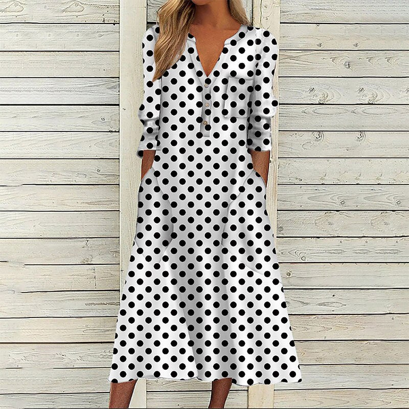 Detalhe: Vestido elegante de manga longa, botões no decote V. Saia com bolsos frontais. Tecido leve e confortável. Corte evasê, comprimento midi.