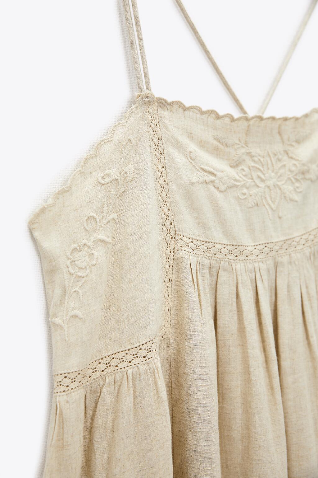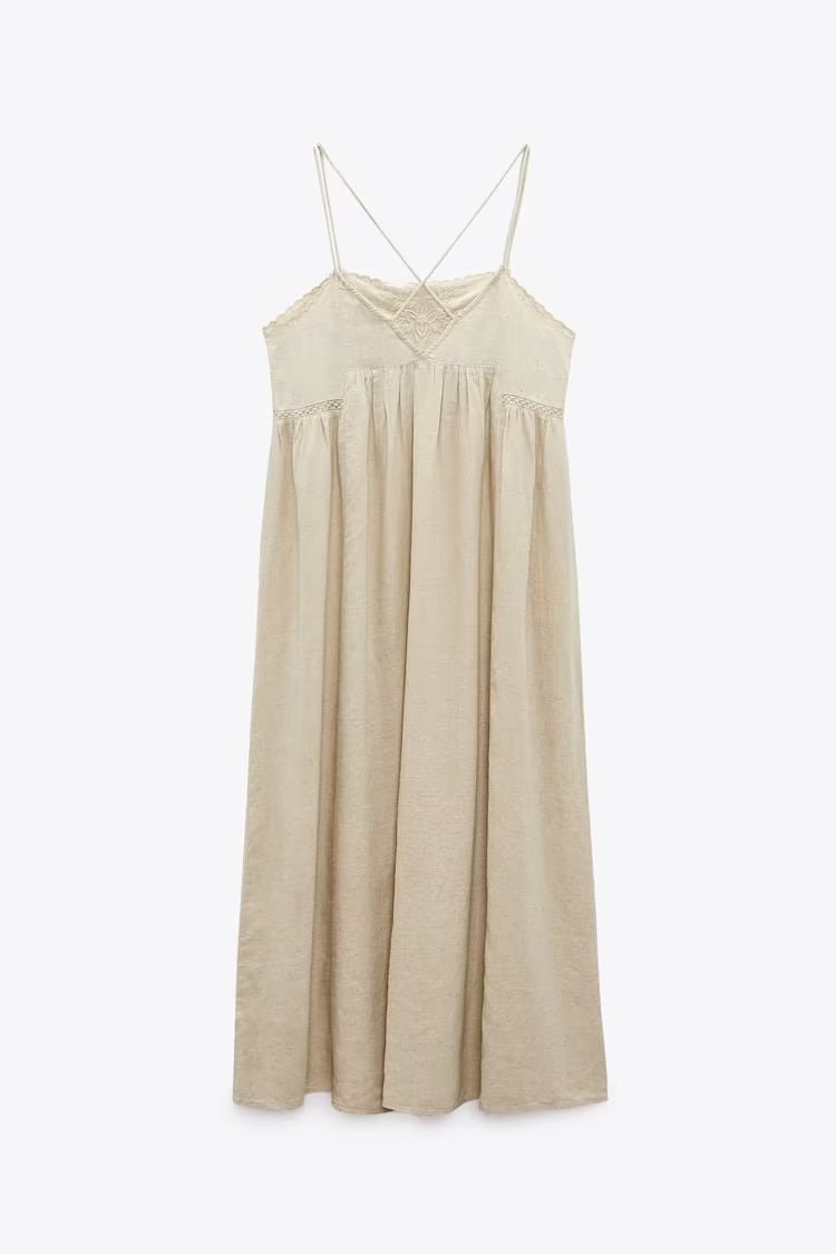 Detalhe: Vestido Midi de alcinha em linho com elastano, detalhes em bordado, saia ampla, tecido encorpado e confortável.