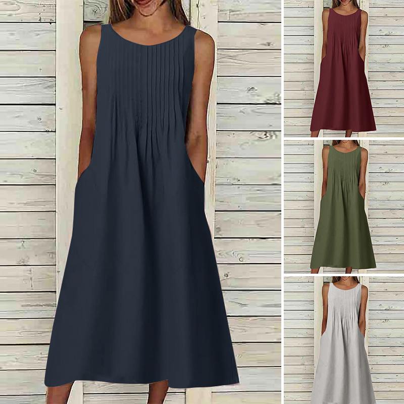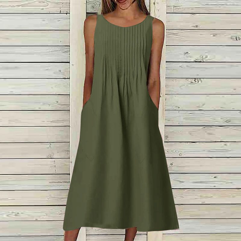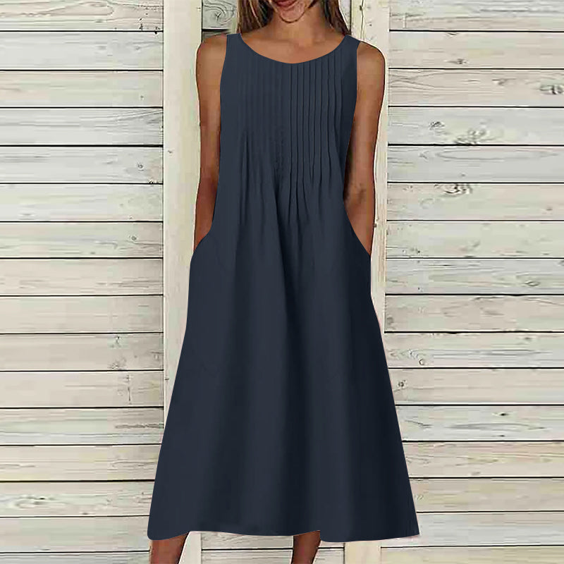 Vestido midi sem manga, apresentando detalhes na parte do top e bolsos laterais. Com saia ampla e fluida, esse vestido oferece um visual casual elegante. Feito com tecido encorpado e confortável, o Vestido Eloá Midi é perfeito para destacar sua beleza em qualquer ocasião.