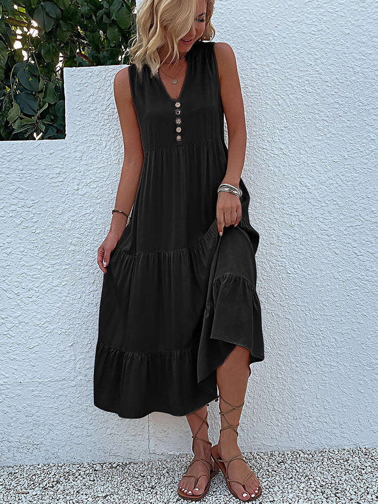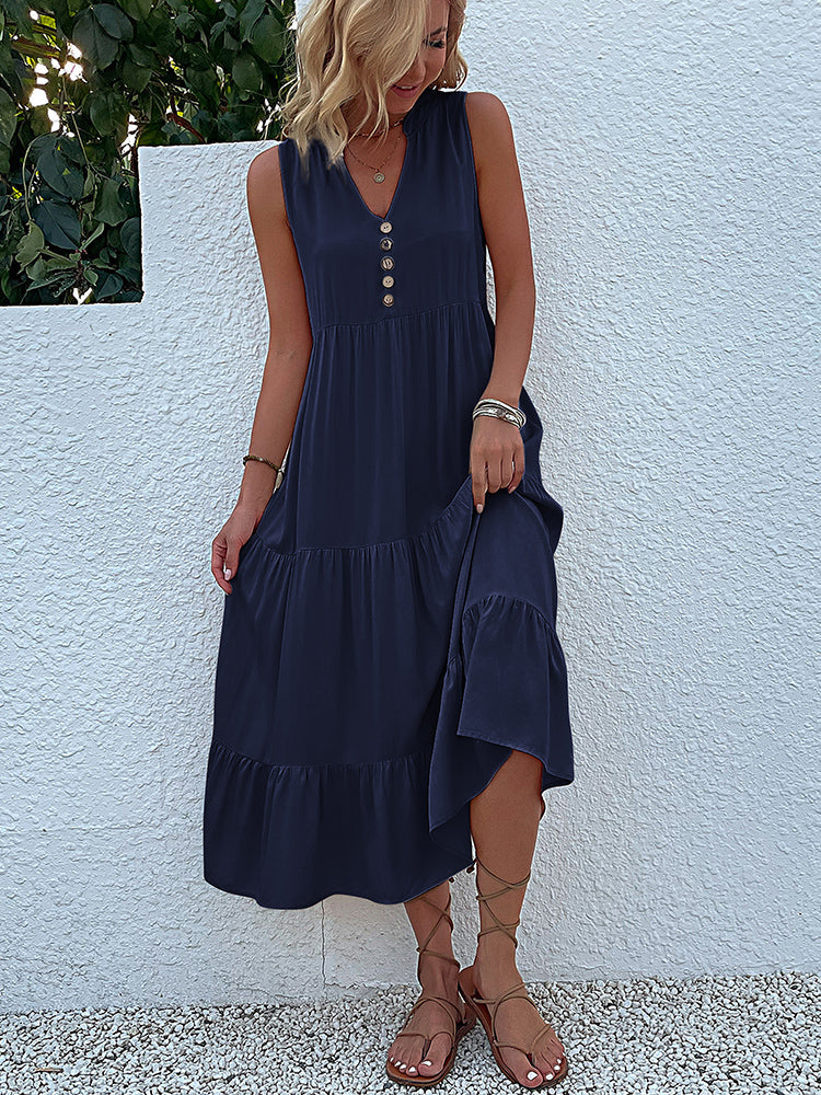 Detalhe: Vestido longo sem manga, saia 3 Marias; tecido encorpado e confortável.