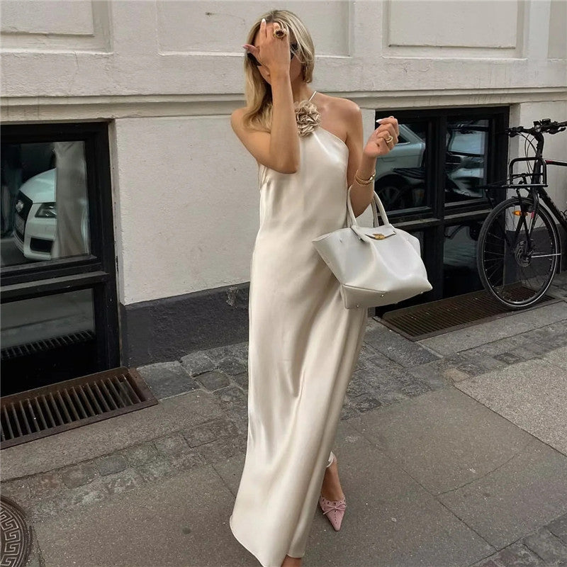 Vestido longo sem manga em cetim, apresentando detalhe com flor e sem costas. Com saia ampla e fluida, esse vestido oferece um visual elegante. Feito com tecido encorpado e confortável, o Vestido Megan Flower é perfeito para destacar sua beleza em qualquer ocasião.